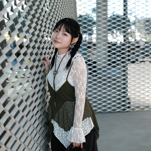 首頁- Girl's shirt >《禧事臨門》蕾絲 透膚 撞色 反車線 高領 花苞袖 上衣B585