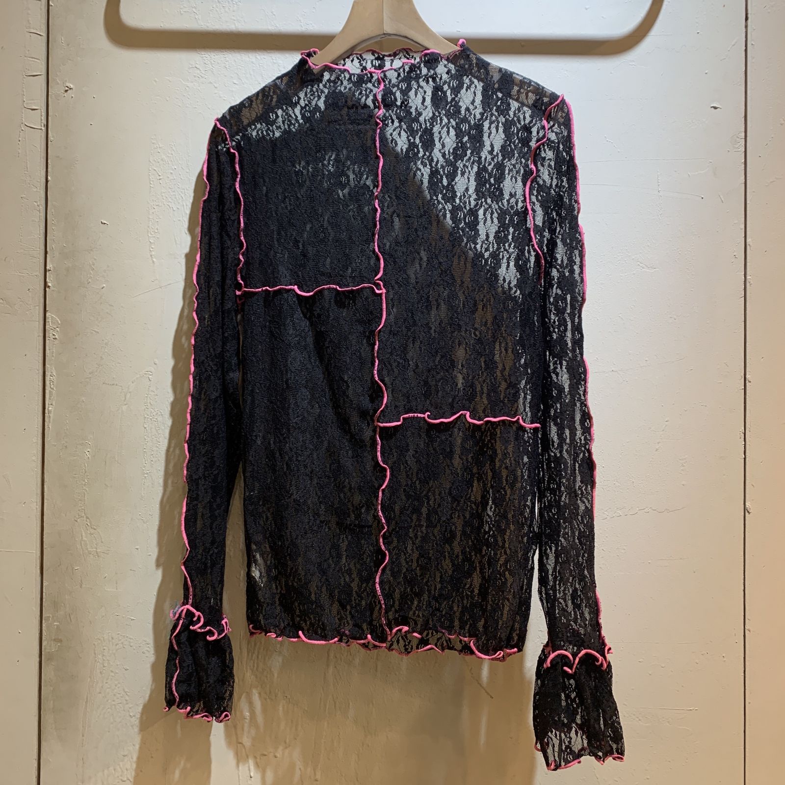 商品蕾絲 透膚 撞色反車線高領花苞袖上衣: