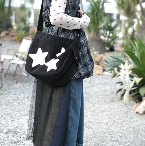 《禧事臨門》燈芯絨 星星 拼接 側背 肩背 大容量 拉鍊半月亮包 E192